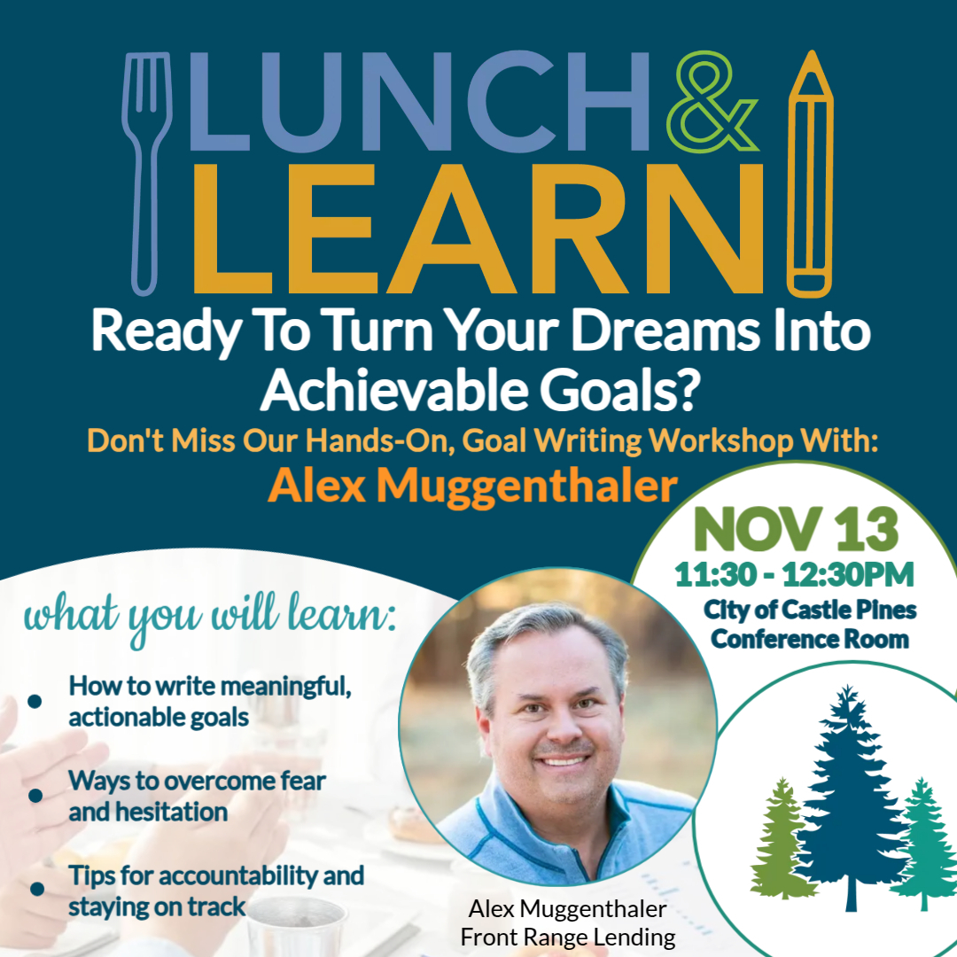 | 11/13/2025 | Goal Writing Workshop with Alex Muggenthaler – Front Range Lending Are you setting goals that actually work — or just making wish lists? What You’ll Learn: You’ll leave with: Whether you’re an entrepreneur, a business professional, or someone looking for a reset, this session will equip you to move forward with clarity and purpose. more info... |